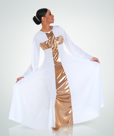 Long dress has slip-over-the-head styling, long semi bell sleeves with hidden elastic wrist bands for a perfect sleeve fit, a generously flared body with an ultra full sweep skirt and features a front sewn-in metallic cross.