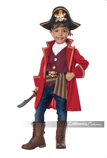 Product Description: No swashbuckling adventure is too big for this mighty pirate. The Cap'n Shorty toddler costume is a jacket with gold trim, a pull over vest with decorative buttons, a belt and a waist sash. It also includes a white neck cravat, a bandana and hat. Not included: pants, toy sword, boots.