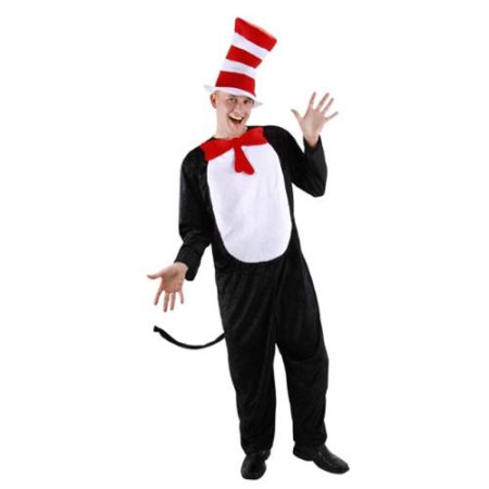 Product Description Cat in the Hat Adult costume includes jumpsuit with attached bow tie, detachable tail and hat.