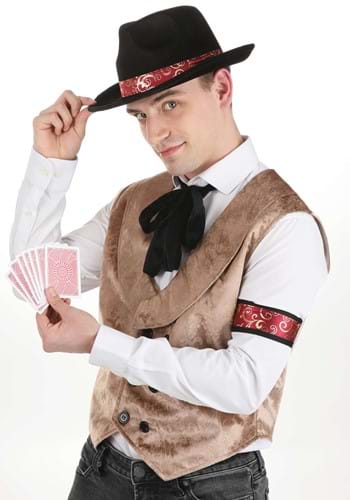 Always have the winning hand when you wear your exclusive Gambler Costume Kit for Men! The set includes a brown velout vest that's embellished with a sculpted floral design and a shawl collar. The red and black taffeta arm band fits comfortably thanks to the elastic in its back. The molded velour hat is decorated with a ribbon that matches your arm band. The floppy black velour necktie can be tied as desired.