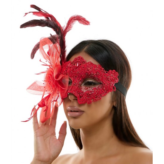This black lace fascinator mask features elegant detailing, sparkling accents, and a tall feathered side embellishment with mesh and a rosette. Perfect for gothic themes, masquerade balls, and Halloween events. A dramatic and timeless costume accessory.