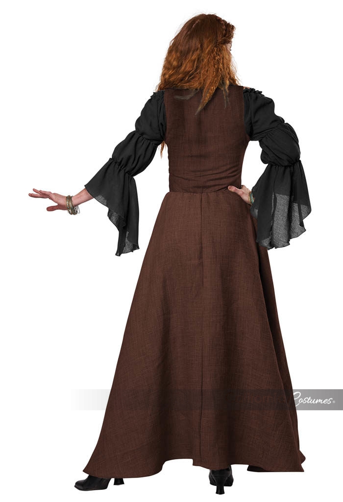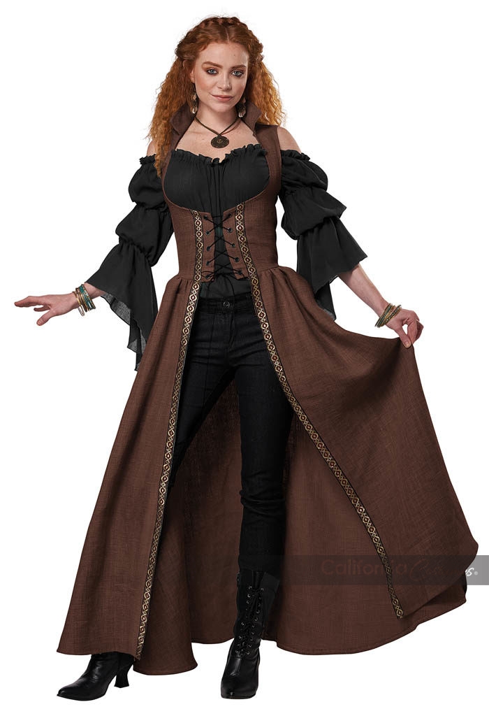 Product Description: This one piece overdress in brown features a lace up bodice and attached lapel collar. Pair it with your own dress to create your own medieval outfit.
