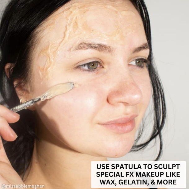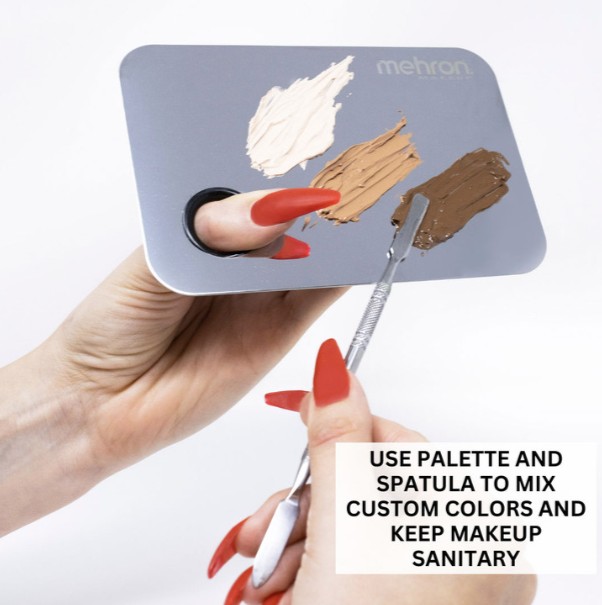 Use Spatula to scoop makeup out of containers and onto Mixing Palette. Prevent cross-contamination and custom mix cream paints, foundations, and more. Wipe excess product off of Mixing Palette and Spatula and sanitize with Mehron's Cosmetic Sanitizer Spray or 70% Alcohol.