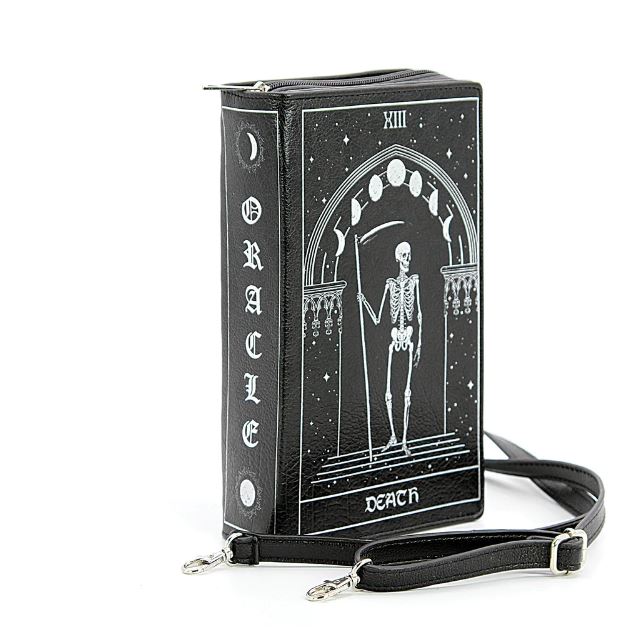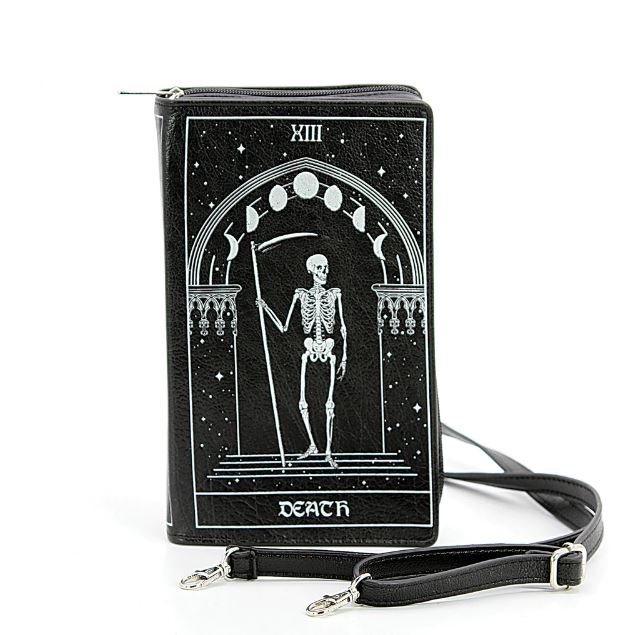 It has an inside divider compartment and it comes with a 24 inch shoulder strap drop and a 6 inch wristlet drop.