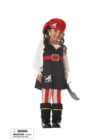 This costume is living proof that not all pirates are mean and ugly, the Toddler Precious Little Pirate Costume for girls. The Precious Pirate outfit includes a black dress with an attached belt, a red bandana with a skull and crossbones patch, a pair of red and white pirate tights and gold trimmed boot tops. This pirate ensemble for girls is available in one standard size suitable for girls in sizes 3T to 4T. Add even more to the look of this costume with a Silver and Gold Pirate Cutlass and a Pirate Pouch that will come in handy for storing candy and treats on Halloween. Your little one will be the sweetest swashbuckler on the seas this Halloween in this great, adorable costume.