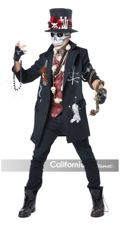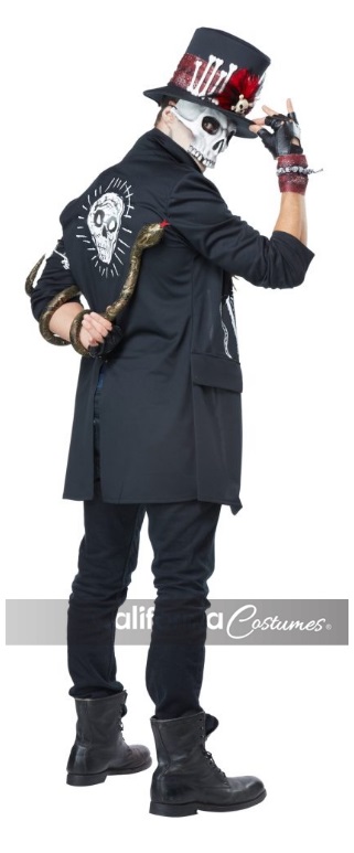 He can craft an array of charms to help and harm. The Voodoo Dude costume comes with a jacket with attached vest, a hat with bone and skull decoration, a half mask, and a pair of skeleton paws. Various necklaces, beads, snake, gloves, pants and shoes not included.